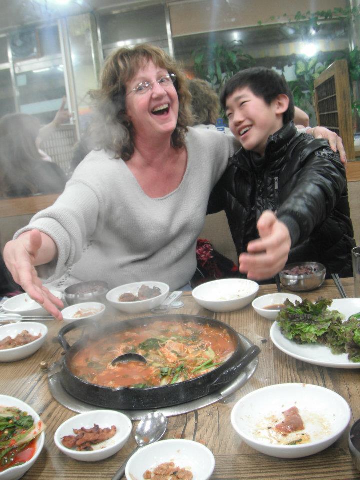 Herein, lay your eyes upon the nourishment derived from the previously mentioned fermentation pots. In front of the legendary warrior Tom is a stone pot filled with “dwinjang soup.” Smooth, savoury and a little bit spicy, dwinjang soup is one of the most universally popular dishes in Korea. To the right, international spy Anna poses her sharpened assassination chopsticks over fermented cucumbers, kimchi and a delightful dish of gochujang-covered calamari.