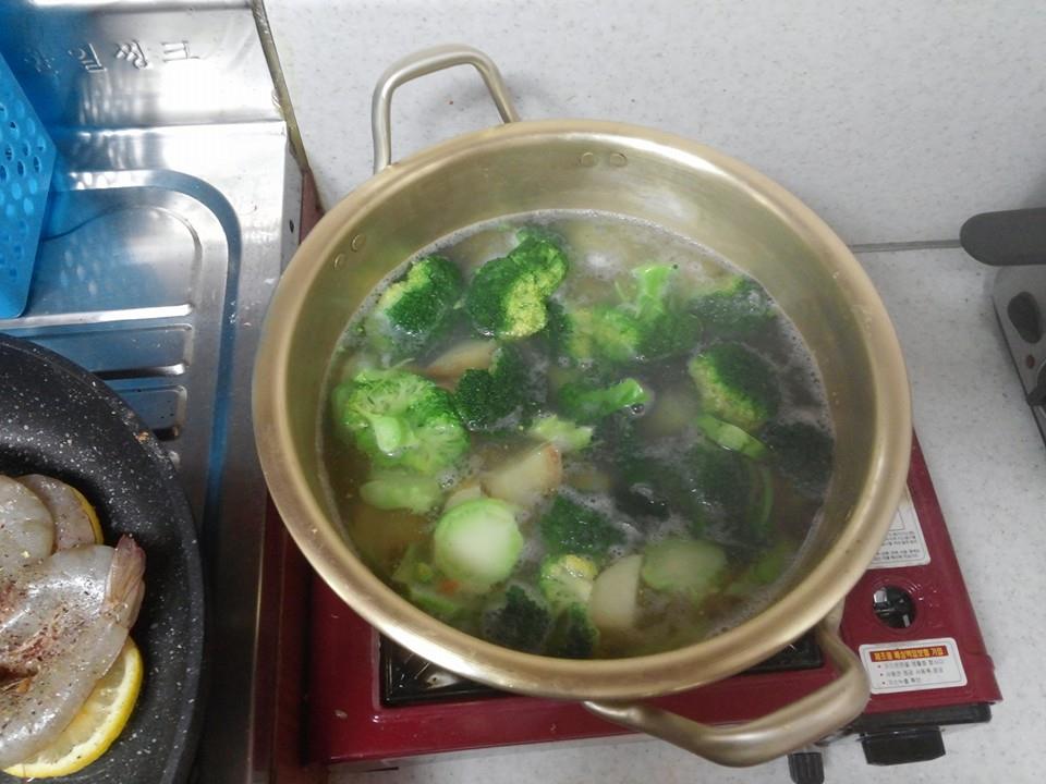 The base is very easy to make. Cut the potatoes into pieces about half the size of your thumb, combine with chopped broccoli and boil until they are just starting to get soft. The shrimp is going to be crunchy and you want the base to compliment that crunchiness. After you’ve boiled the potatoes and broccoli, cut them into smaller chunks while stirring in 20-30 grams of butter, fresh, thinly sliced carrot, salt and black pepper. Set this aside and get started on the mushroom garnish.