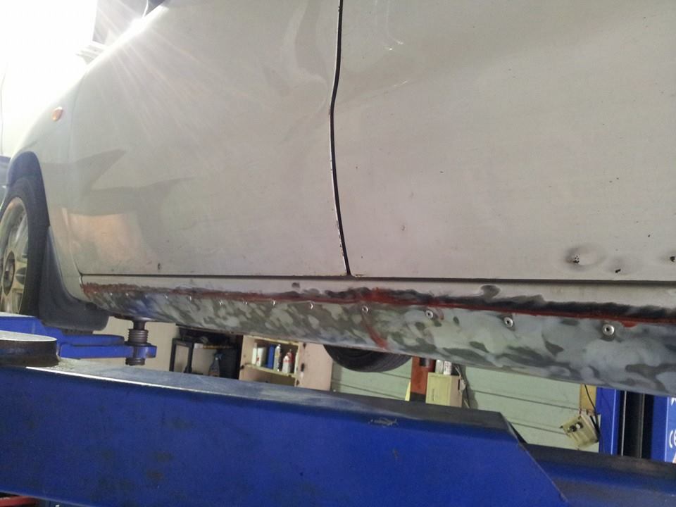Now, the activity most likely to take over and ruin my life – rust repair. Before this weekend my Nubira had been the recipient of two new rear shock towers (both rusted through), two enormous patches on the drivers side sill, a new front fender and a section of trunk. Sunday, as I got the car up on a lift – thanks Turbo Spark for letting me use the shop – I discovered six new rust holes in the passenger side sill.